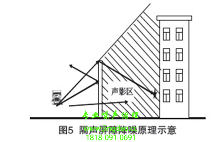 隔声屏障降噪原理 隔声屏障的降噪原理主要是在道路声源和受声点之间设置障碍物,主要功能是阻挡声音的传播,将一部分声能反射回去,仅使部分声能绕射过去,在隔声屏障背后形成一个声影区,从而使噪声降低。道路声源辐射的噪声遇到隔声屏障时将沿着三条途径传播:首先声波是绕射至隔声屏障声影区;第二条是声波直接透过隔声屏障到达声影区;第三条是声波在隔声屏障壁面上产生反射。隔声屏障的降噪效果主要与屏障的高度和长度及声源与受声点的距离有关。其原理见图5。 ![]() 在声源高度的确定方面,因车辆行驶噪声主要由动力噪声和轮胎噪声构成,各类车辆的声源高度不同,小型车为0.2~0.5m;中型车为0.7~1.0m;大型车为 1.5m。为简化计算,取三种车型的平均高度1m为声源高度。 该小区西环北路为双向4车道,在确定声源与受声点距离时,按等效距离计算,等效距离DE计算公式如下: ![]() (1)无限长线声源,无限长隔声屏障绕射声衰减 ![]() 当声源为一无限长不相干线声源时,其绕射声衰减为: (2)无限长线声源及有限长隔声屏障 △Ld仍由上述公式计算,然后根据图6进行修正。修正后的△Ld取决于遮蔽角β/θ。 、 |